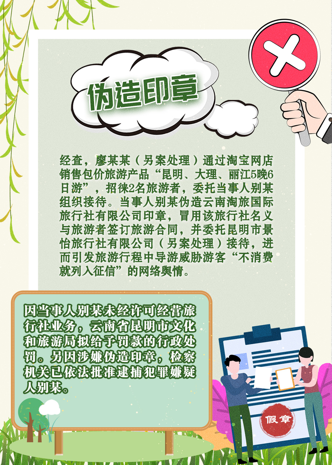 ——关键字:伪造印章。经查,廖某某(另案处理)通过淘宝网店销售包价旅游产品“昆明、大理、丽江5晚6日游”,招徕2名旅游者,委托当事人别某组织接待。当事人别某伪造云南淘旅国际旅行社有限公司印章,冒用该旅行社名义与旅游者签订旅游合同,并委托昆明市景怡旅行社有限公司(另案处理)接待,进而引发旅游行程中导游威胁游客“不消费就列入征信”的网络舆情。因当事人别某未经许可经营旅行社业务,云南省昆明市文化和旅游局拟给予罚款的行政处罚。另因涉嫌伪造印章,检察机关已依法批准逮捕犯罪嫌疑人别某。
