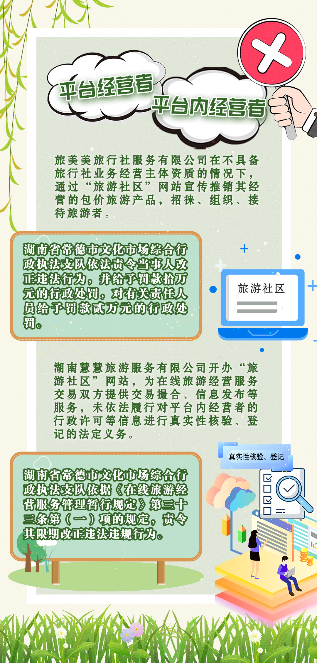 ——关键字:平台经营者、平台内经营者。旅美美旅行社服务有限公司在不具备旅行社业务经营主体资质的情况下,通过“旅游社区”网站宣传推销其经营的包价旅游产品,招徕、组织、接待旅游者,湖南省常德市文化市场综合行政执法支队依法责令当事人改正违法行为,并给予罚款拾万元的行政处罚,对有关责任人员给予罚款贰万元的行政处罚。湖南慧慧旅游服务有限公司开办“旅游社区”网站,为在线旅游经营服务交易双方提供交易撮合、信息发布等服务,未依法履行对平台内经营者的行政许可等信息进行真实性核验、登记的法定义务,湖南省常德市文化市场综合行政执法支队依据《在线旅游经营服务管理暂行规定》第三十三条第(一)项的规定,责令其限期改正违法违规行为。