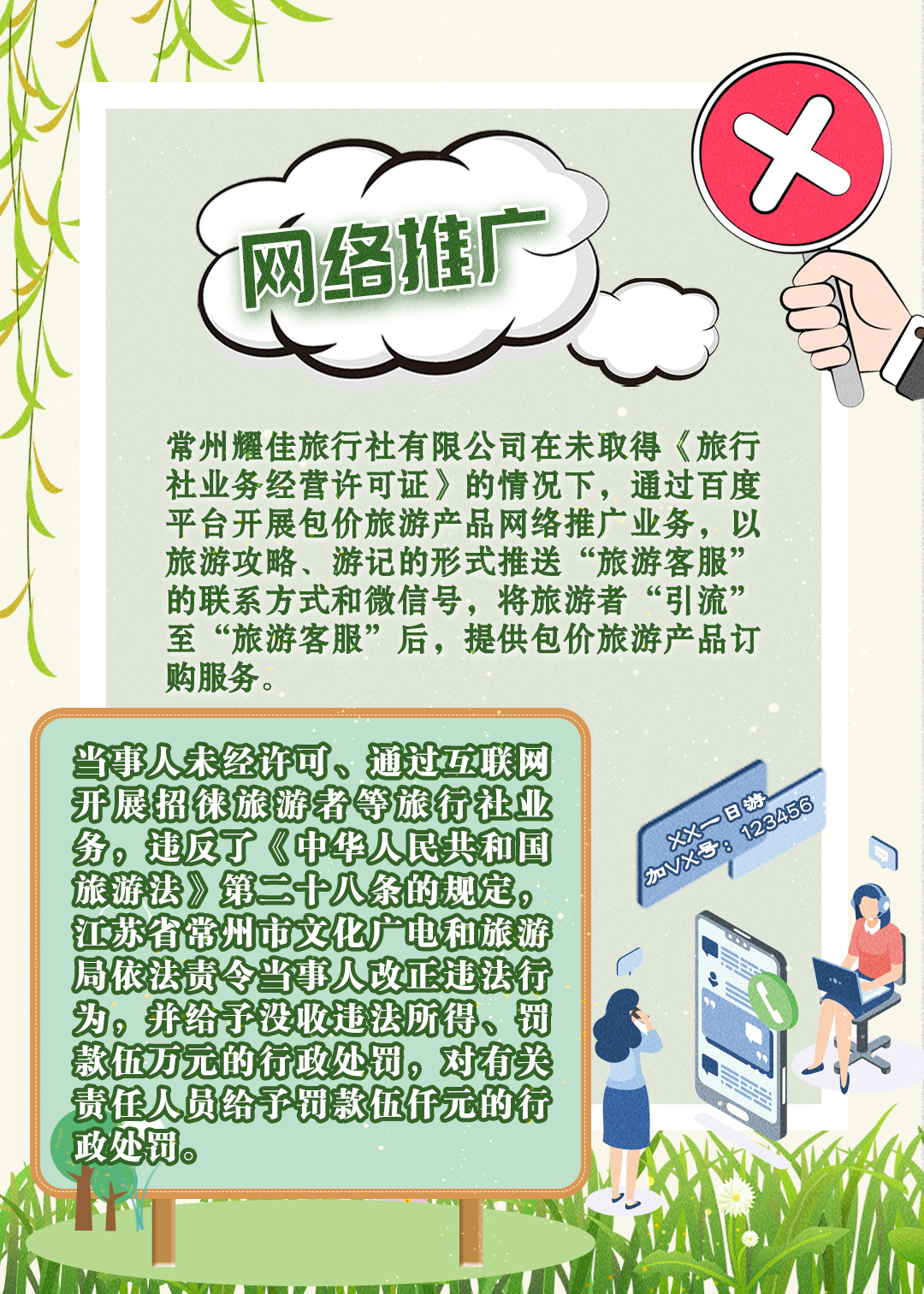 ——关键字:网络推广。常州耀佳旅行社有限公司在未取得《旅行社业务经营许可证》的情况下,通过百度平台开展包价旅游产品网络推广业务,以旅游攻略、游记的形式推送“旅游客服”的联系方式和微信号,将旅游者“引流”至“旅游客服”后,提供包价旅游产品订购服务。当事人未经许可、通过互联网开展招徕旅游者等旅行社业务,违反了《中华人民共和国旅游法》第二十八条的规定,江苏省常州市文化广电和旅游局依法责令当事人改正违法行为,并给予没收违法所得、罚款伍万元的行政处罚,对有关责任人员给予罚款伍仟元的行政处罚。