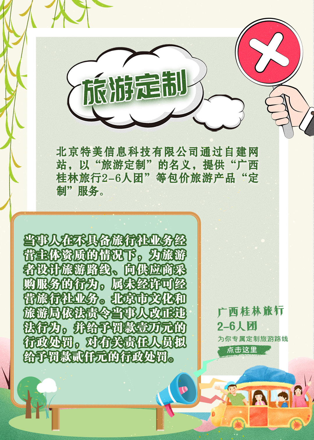 ——关键字:旅游定制。北京特美信息科技有限公司通过自建网站,以“旅游定制”的名义,提供“广西桂林旅行2-6人团”等包价旅游产品“定制”服务。当事人在不具备旅行社业务经营主体资质的情况下,为旅游者设计旅游路线、向供应商采购服务的行为,属未经许可经营旅行社业务。北京市文化和旅游局依法责令当事人改正违法行为,并给予罚款壹万元的行政处罚,对有关责任人员拟给予罚款贰仟元的行政处罚。