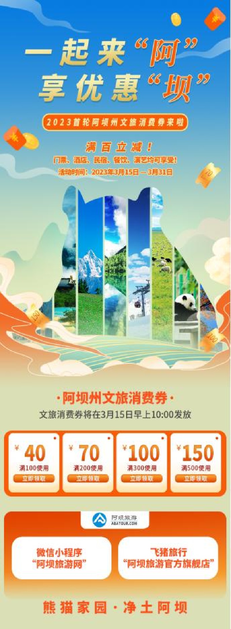 文旅消费券发放平台:文旅消费券在微信小程序"阿坝旅游网"和飞猪旅行“阿坝旅游官方旗舰店”进行发放,设置满100减40元,满200减70元,满300减100元,满500减150元四种文旅消费券。其中: